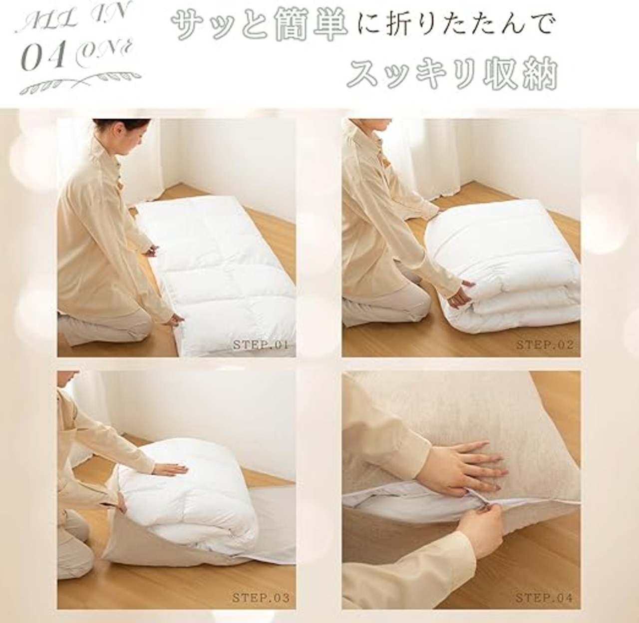 「クッションになる布団収納ケース」収納とインテリアを両立する快適な空間づくりを実現。ナチュラルな色合いの高品質な生地で、来客時にも生活感なく空間に溶け込みます。布団収納だけでなく、インテリアとしても優れたデザインです。