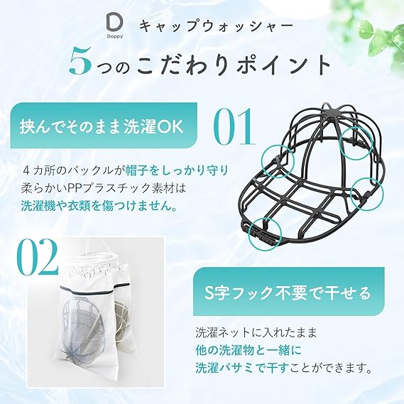 【日経MJ・保育専門誌に掲載】【現役クリーニング師が推薦】便利性が評価され、日経MJをはじめとするメディアに多数掲載!Dappyのキャップウォッシャーはより楽に清潔な帽子を日々使用して頂くために日本企業(株式会社グローバルアジアパートナーズ)が商品開発を行っています。洗濯機、衣類を傷つけない柔軟性を持ち、また耐久性を保証するためにPPプラスティックを使用しています。