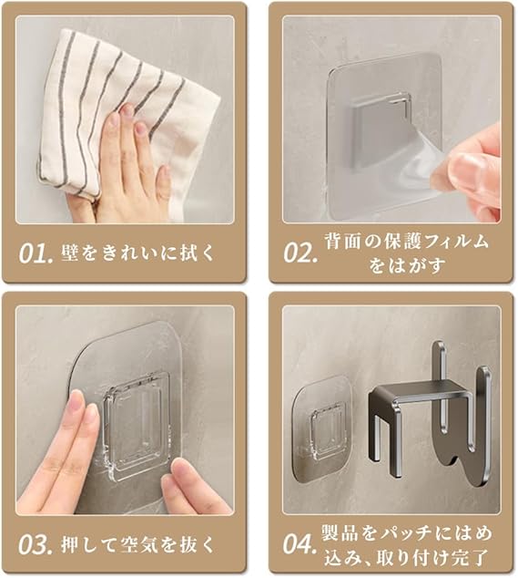【取り付け簡単&壁に優しい】粘着式デザインで、穴を開けずに簡単に取り付け可能!壁やドア、窓ガラス、洗濯機などにしっかり固定でき、壁面を傷つける心配がありません。どんなお部屋にも馴染むシンプルなデザインで、快適な収納を実現します。