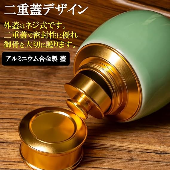 気品高い黄金色の蓋は、頑丈なアルミニウム合金素材を使用し二重構造設計となっております。外蓋はネジ式で密封性に優れ御骨を
