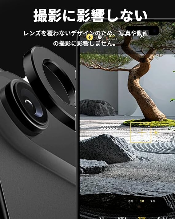 【アルミ合金一体感】アルミ合金素材を採用して、ガラス製カメラフィルムより軽い上に割れることもなく、指紋も付きにくいです。さらにアルマイト処理が施されているので、耐摩耗性にも優れています。縁部分も含め、精確なサイズにカービングされているので引っかかる感じがなく、ほとんどのケースとも干渉しません。 本体のレンズ部分と完全に融合し、違和感がなく、