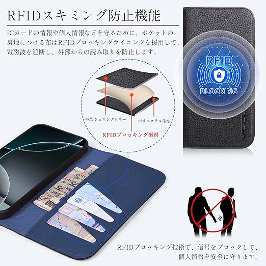 RFIDブロッキング技術・選ばれる理由:ICカードの情報や個人情報などを守るために、カードスロットとポケットの裏地につける布はRFIDブロッキングライニングを採用しています。カードを入れたまま、反応しない場合があり、使用する時はカードを出してから、利用してお願い致します。