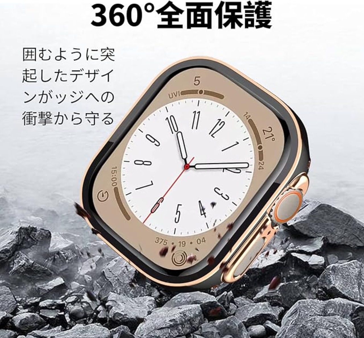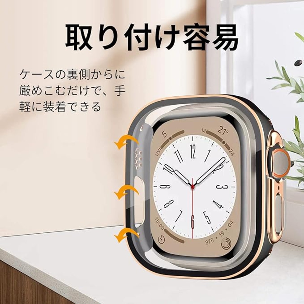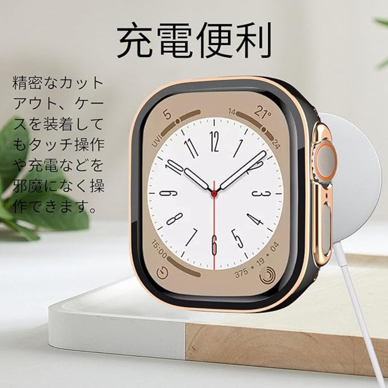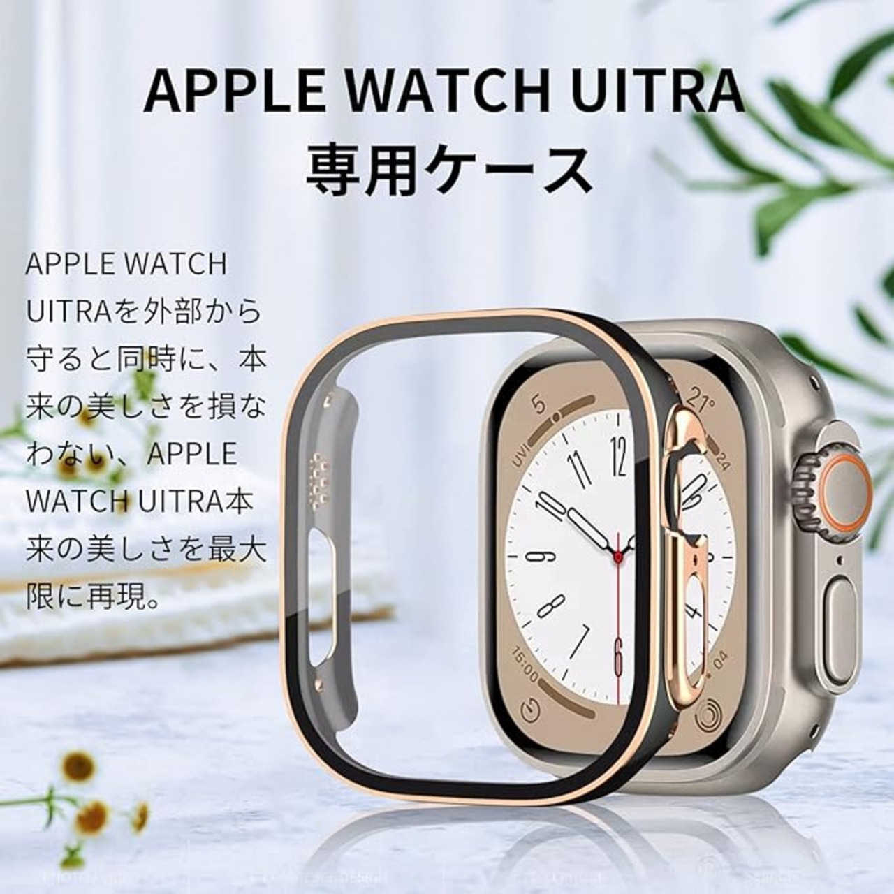 YUGYUG 対応 アップルウォッチ カバー Ultra 3/2/1 アップルウォッチ ケース PC素材 光沢式 Apple Watch ケース ガラスフィルム 一体型 日本旭硝子材 二重構造 Apple Watch カバー 全面保護 強化ガラス キズ防止(49mm,ブラック+ゴールド) a