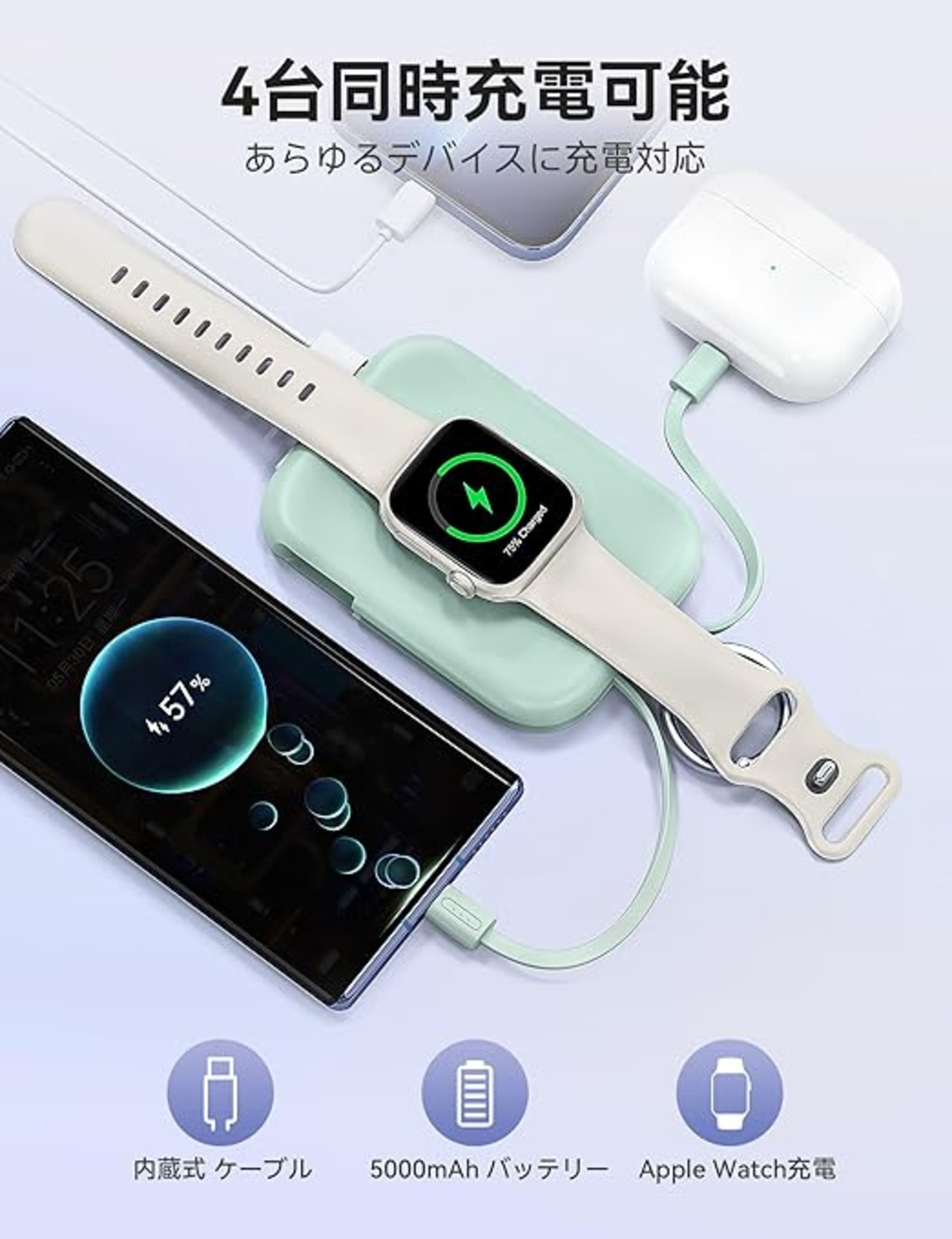 【新色登場】RORRY apple watch 充電器 モバイルバッテリー 5000mAh 2本ケーブル内蔵 【iPhone用+Type-Cケーブル】 アップルウォッチ対応 ワイヤレス充電 同時充電 最大4台同時充電 For Apple Watch ultra2/9/8/7全シリーズに対応 軽量 小型 コンパクト 持ち運び/PSE認証済 for iPhone 15/14/Android グリーン a
