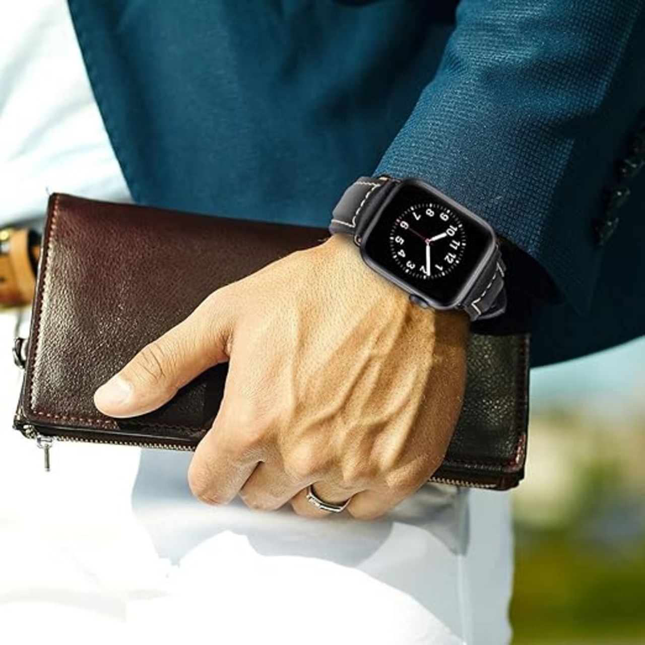 上質な素材を使用:100%本革のストラップ。上質なイタリア製牛革を使用(使い始めは少し硬く、数回使用すると柔らかくなります)。天然皮革のシボが、ストラップにスタイリッシュな雰囲気と質感を与えています。ストラップの裏地にもカーフレザーを使用し、快適な装着感を実現しています。また、磨耗に強いのも特徴です。