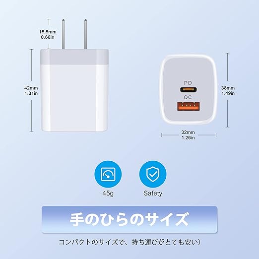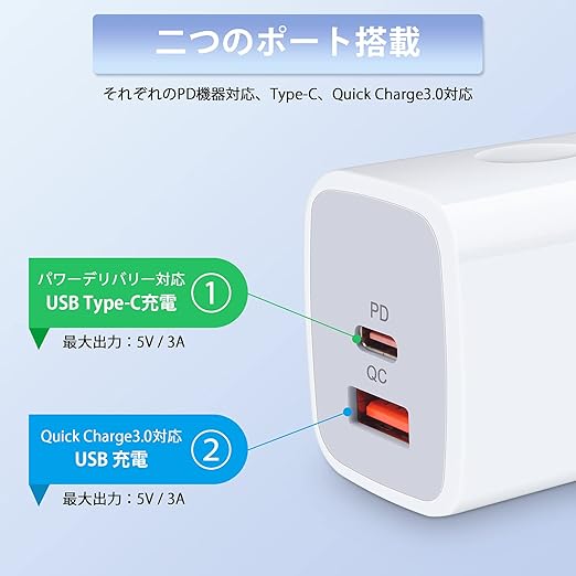 【USB-C&USB-A 2ポート搭載】当社の充電器はPower Delivery3.0対応のUSB CとQuick Charge対応のUSB Aの2ポートを搭載し、どんなケーブルにも対応でき、充電器1個だけで十分。USB-C単ポートで20W、USB-A単ポートで18Wを出力します。同時に充電する場合、自動判別機能を通して、接続されたデバイスに最適な電流を出力します。(ご注意:2ポート同時使う時、通常充電になりますので、急速充電したい場合は、単ポートで使用してください)