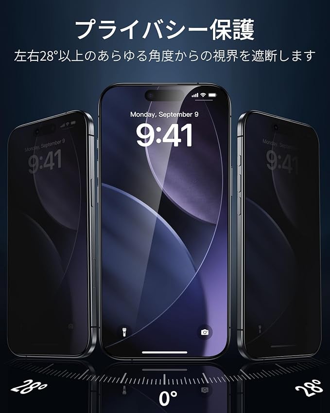 【強力プライバシー保護】iPhone 17 Pro ガラスフィルムの高度な覗き見防止フィルターが28°以上の角度からの視界を遮り、iPhone 17 Proの画面をあなただけに届けます