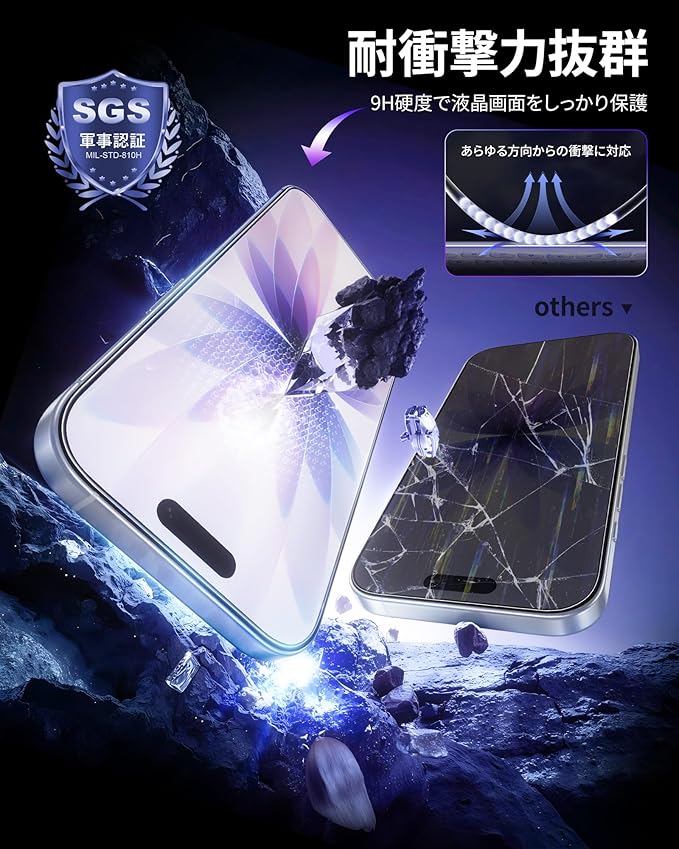 「耐衝撃・飛散防止」米軍規格「MIL-STD-810H」に準拠(認証番号:SZXEC23002005001)9H表面硬度ガラスを採用しており、外部からの衝撃を吸収し、画面へのダメージを最小限に抑えます。鞄やポケットのなかで鍵などの鋭いものにぶつかっても傷が付きにくいです。飛散防止加工により、万が一割れてもガラス破片が飛び散ることなく安心して使えます。