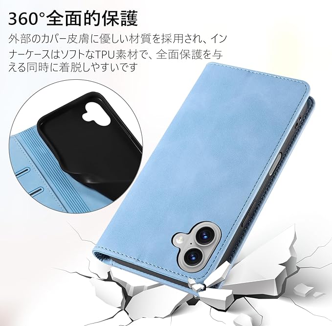KWATUNG iPhone 17 用 ケース 手帳型 アイフォン 17 用 ケース 手帳型 おしゃれ あいふおん17用 手帳型ケース 肌感レザー 内蔵マグネット 耐衝撃 iPhone 17用 スマホケース 手帳型 カード収納 スタンド機能 全面保護 アイホン17 用 6.3インチ ライトブルー