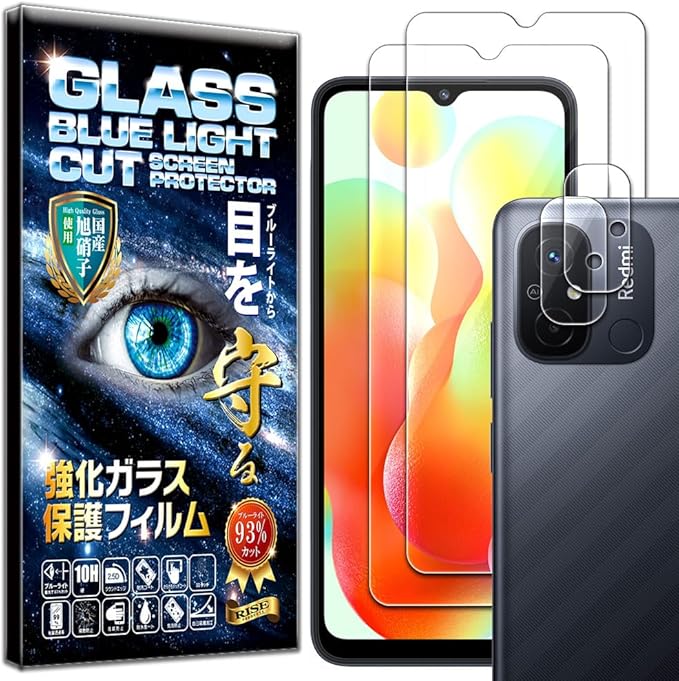 【2023年最新強化モデル】RISE 2枚+2枚 フィルム Xiaomi Redmi 12C ガラスフィルム ブルーライトカット カメラフィルム レンズフィルム レンズ保護ガラス レンズカバー 保護フィルム 強化 ガラス 高透過 高光沢 日本製 旭硝子 0.26mm 硬度10H 2.5Dラウンドエッジ 自動吸着 気泡ゼロ 飛散防止 指紋防止 撥水撥油 3D タッチ For Xiaomi Redmi 12C a