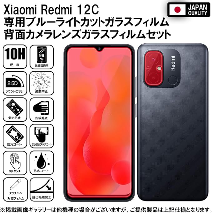 【対応機種及び仕様】Xiaomi Redmi 12C ブルーライトカットガラスフィルム2枚+クリアカメラレンズ保護ガラスフィルム2枚セット。※ご注意ください ブルーライトカットガラスは太陽光の下では青く反射します、その為、使う方によっては画面が見えずらい場合がございます。日中太陽光が当たる屋外での使用頻度が多い場合はブルーライトカットタイプではなくクリアタイプをお勧めします。■ブルーライトカット率の高いガラス素材を使用。■安心の日本製素材 国産AGCガラスを使用。■第3世代製法の最新技術のW硬化
