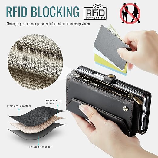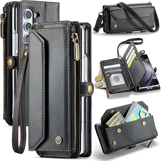 XIMAND for Samsung Galaxy Z Fold 6 ウォレットケース、6つのカードスロット、RFIDブロッキング、マグネット開閉、ジッパー、現金紙幣ポケット、プレミアムPUレザー、クロスボディリストレットストラップ、Sペンホルダー付き - ブラック a