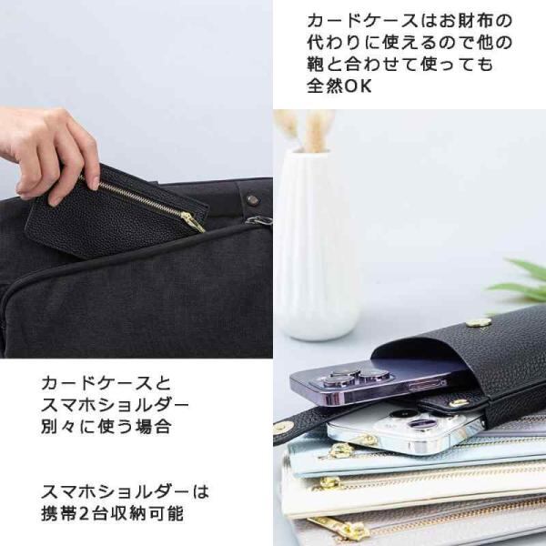 【サイズ・仕様】スマホポーチ:約11×19×3.5cm(ショルダーストラップの長さ/72〜134cm)メインポケット×2 カードケース:約9×16×0.5cm お札入れ×1&ファスナー付き小銭入れ×1、カード入れ×6