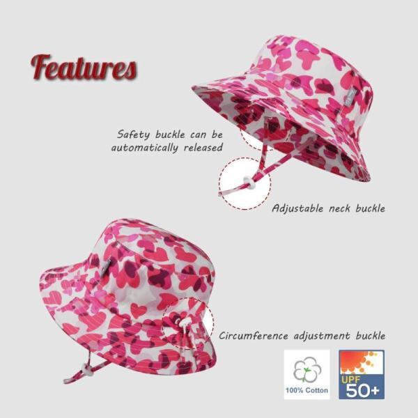 【調節可能な紐・安全バックル付き】帽子には安全バックルがあるあご紐が付いています。風の強い時でも吹き飛ばされる心配がありません。非常時に引っ張って安全バックルを自動的に取り外してお子様の首を締め付けることを防ぎます。ハットの頭部にはサイズを調整できる紐が付いていて、頭に合わせて自由に調整できます