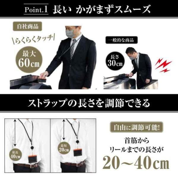 パスケース 【60cm伸縮リール】「30cmじゃ短い」というお客様の声から余裕の60cm伸縮リールで無理なくタッチ。首にかけたままセキュリティゲートも、しゃがまずに楽々タッチ。