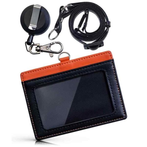 IDカードホルダー 厳選牛革【クリップ付き伸縮リール】 パスケース メンズ カードケース ネックストラップ 首掛け RAKUPORTE1
