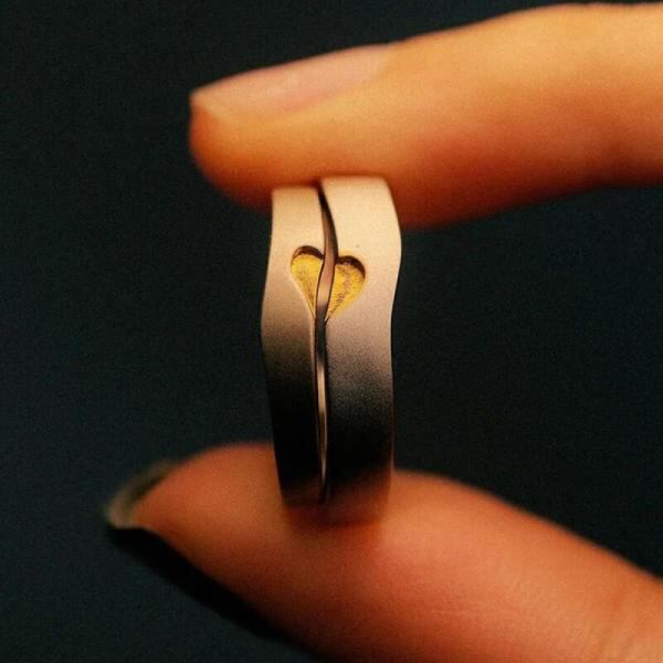 2人の指輪を並べると1つのハートができあがるとっても素敵なモチーフ。