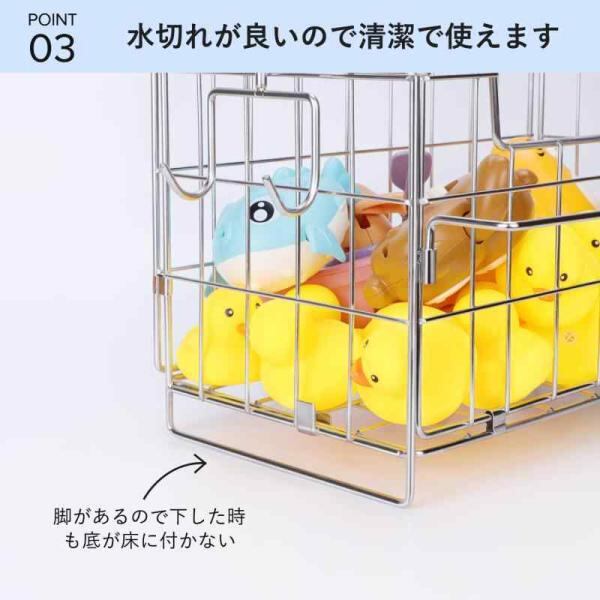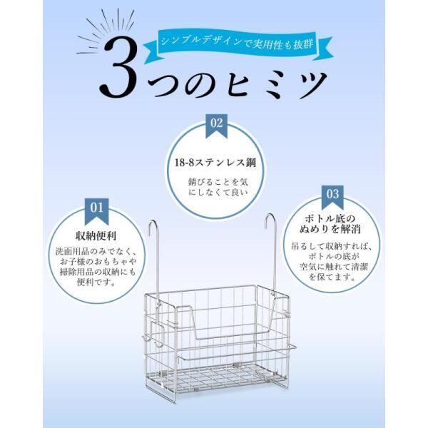 ?【水切れが良いので清潔です】網状のバスケットだから、バスケットで引っ掛け収納をすることで、シャンプーたお子供様のおもちゃなどのボトルに付着した水分を自然と落としてくれます。水分残りによる水アカヌメリも防ぐことができ衛生的。