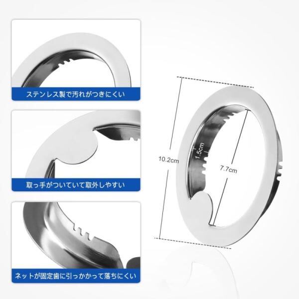 【商品仕様】内径7.7、外径10.2、高さ1.5cmです。 直径8〜10cm、高さ1.5cm以上の排水口に適用。パッケージ内容:髪の毛キャッチャーX1個;髪の毛キャッチャーネットX 100枚
