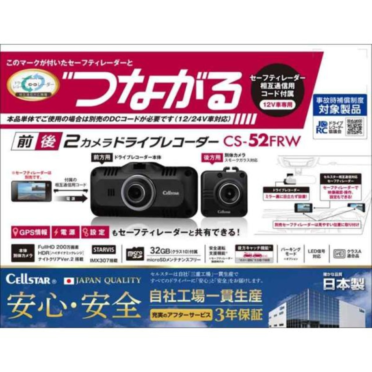 セルスター ドライブレコーダー 前後2カメラ CS-52FRW 200万画素/200万画素 FullHD HDR STARVIS microSD(32GB)付 駐車監視機能 安全運転支援機能 レーダー探知機と相互通信 日本製 3年 CELLSTAR