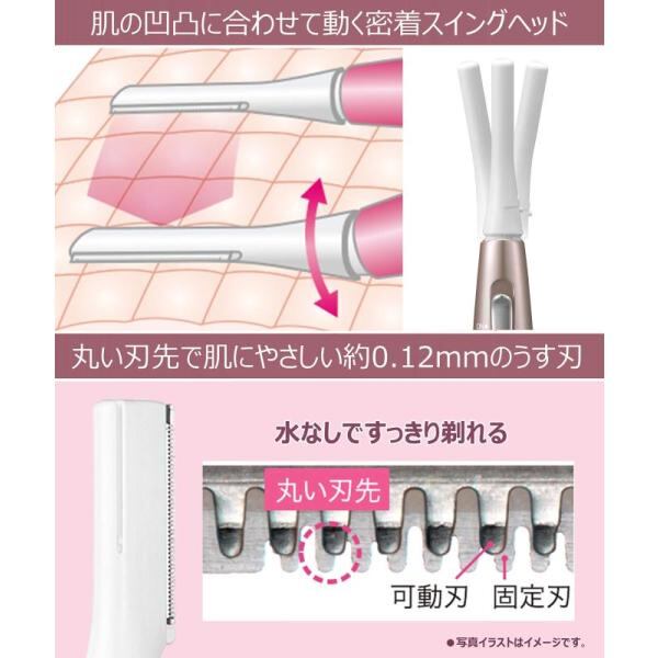 フェリエ:肌にやさしい丸い刃先で、ウブ毛をカット。肌の凸凹に合わせて動く、密着スイングヘッド。充電式電池1が使え、経済的&エコ。