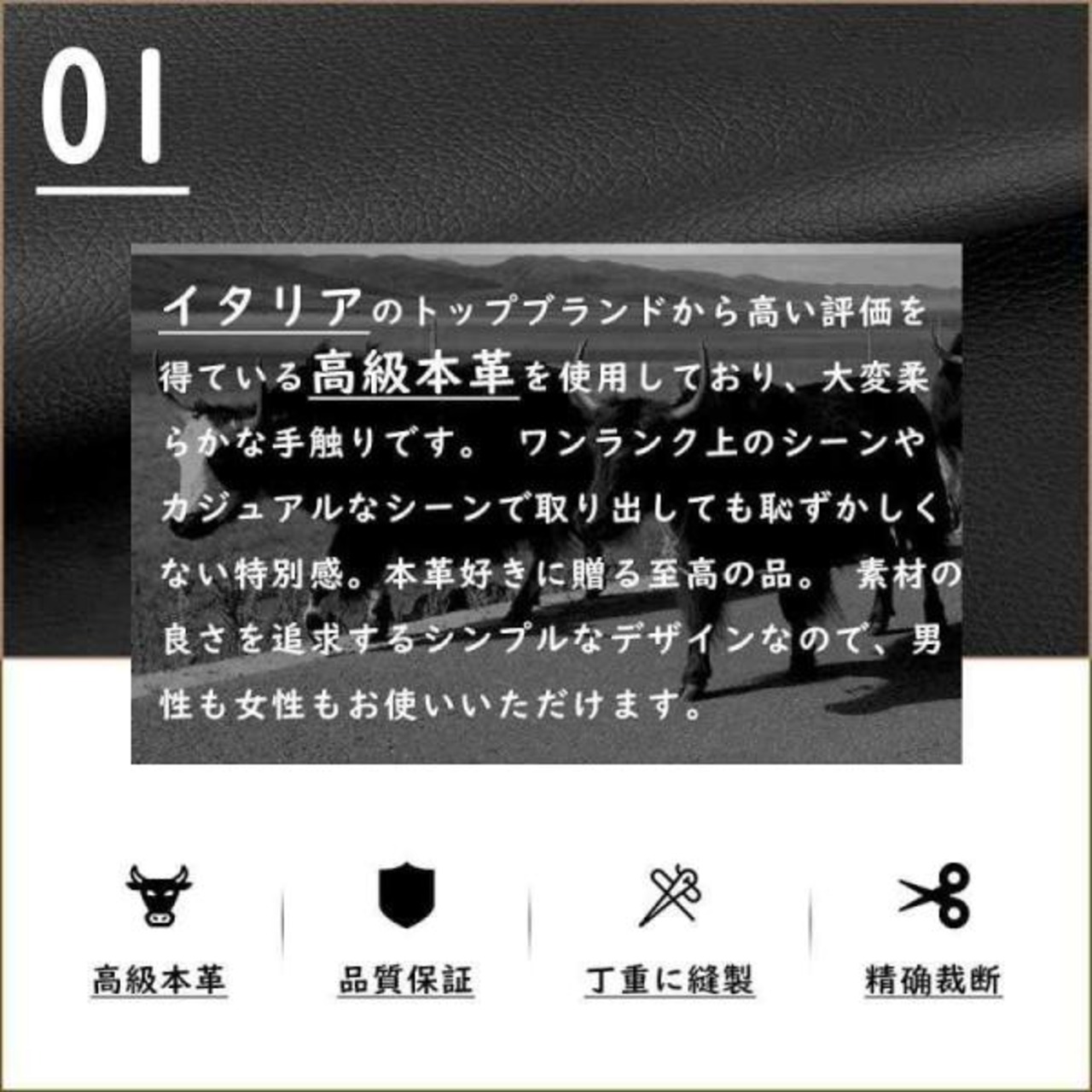 ?【高級牛本革】イタリアのトップブランドから高い評価を得ている高級牛本革を使用しており、大変柔らかな手触りで、見た目もすごく高級感があります。天然皮革(牛革)の特徴として、動物が生きた環境、食べ物、年齢などにより、皮の厚さ・硬さ・質感・シワ・傷・ホクロ・スジ・凹みなどが異なり同じものはふたつとありません。これが、さらに染色などの加工が施され更なる1枚1枚の味わいを醸し出します。経年変化(エイジング)は、自分だけの風合いがでることが革製品の醍醐味。使い込むごとに世界に1つだけのアイテムに変化するオンリーワン