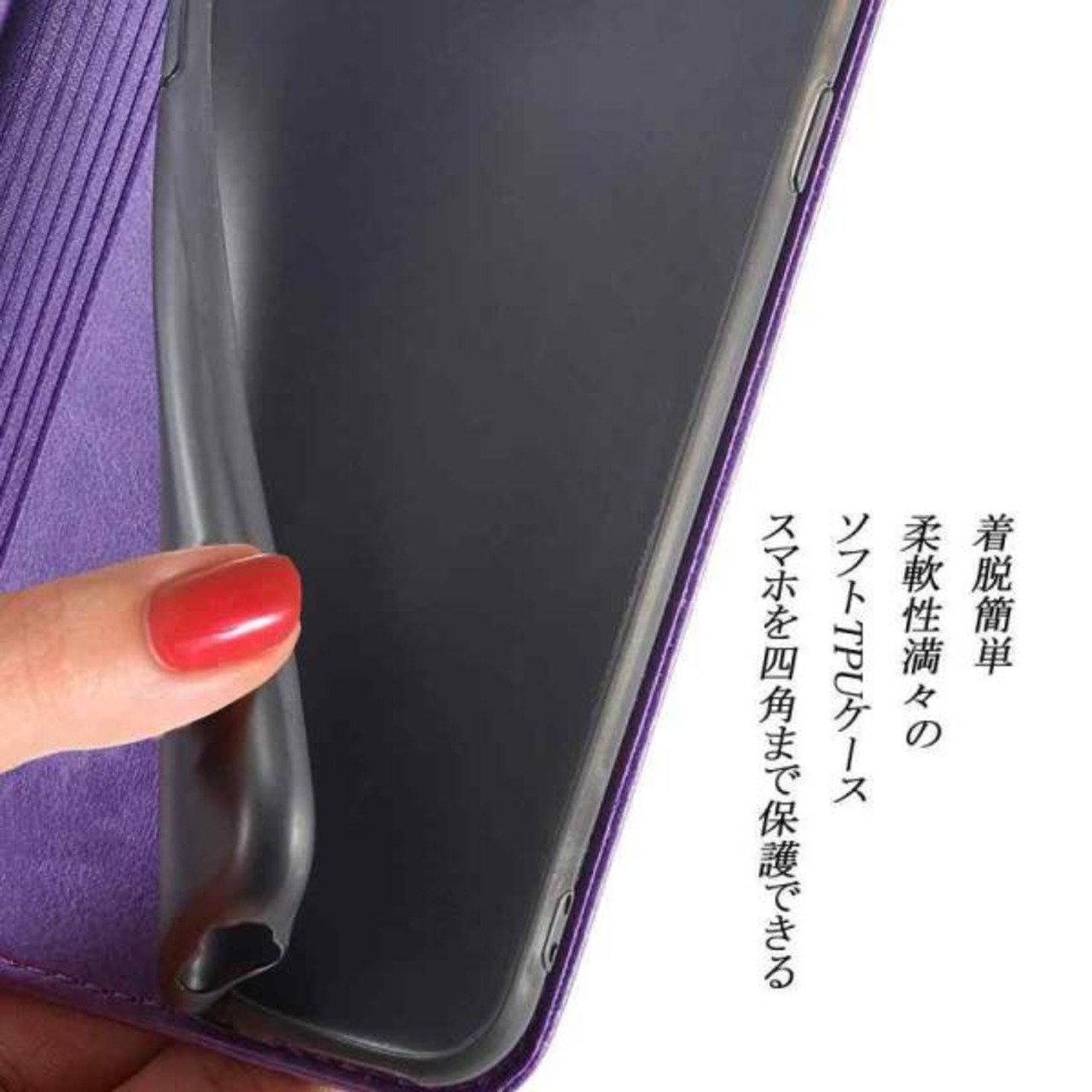 ?【素材改良】本商品の外部カバーは牛革繊維を人工合成という生産プロセスで仕上げられた合革で、普通の合革より、性能上の 耐熱性、耐摩擦が一層アップされた。表面生地が硬すぎず、やわすぎず、ちょっと良い手触りです。手汗が出てきても滑りにくく、ケースにも変な匂いがございません。インなケースは弾力性のあるソフト素材を採用しており、四角までしっかり保護でき、実用性高い手帳型です。