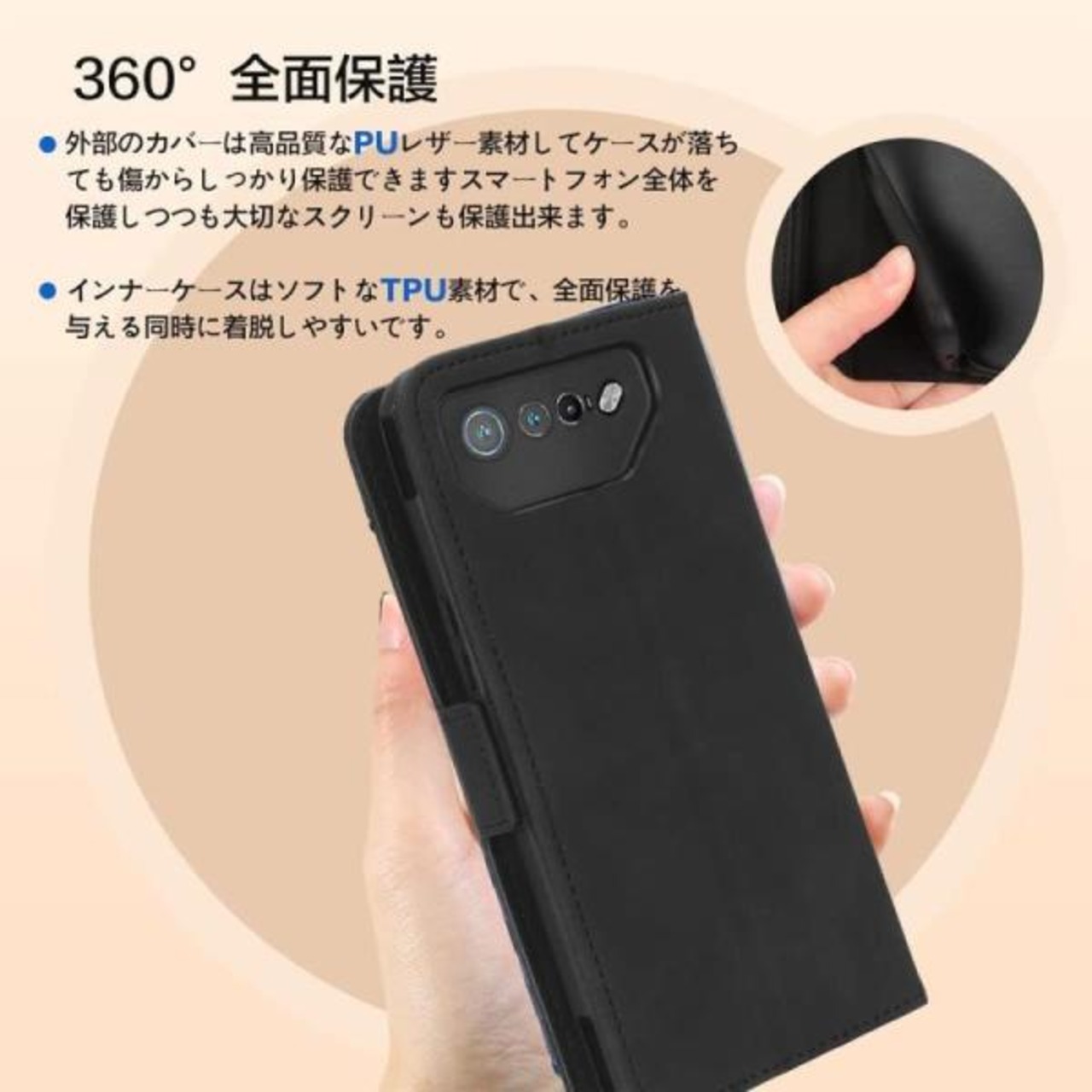 商品の特性1: 裏はTPU素材、表面はPUレザー製ですから。外側には手触りの良く、滑り止めレザーを採用し、衝撃吸収と汚れ防止ができます。内側には柔らかなTPUカバーを使用し、大切なAsus ROG Phone 7を傷や衝撃から守ってくれます。名刺とカードなどを収納することができて、持ち歩きに便利です。