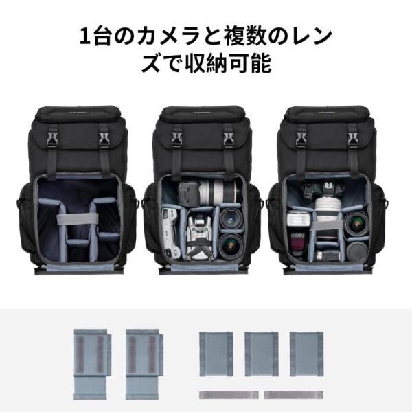 ?【2気室分類収納】カメラリュックサックの正面はEVAハードケースで、180°開閉方式を採用しています。 カメラバッグの内部はマジックテープ式仕切り板、取り外し可、設備の大きさによって自由組み合わせ可能です。通勤バッグ、日常用バッグとしても使え、整理するのがより便利です。 (内部構造:上下2室構造、上部には日用品や衣類を収納でき、下部にはカメラや複数のレンズを収納できます。)