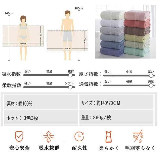 【大判 バスタオル 3枚セット】素材:綿100% サイズ:約70×140cm 重さ:1枚あたり 約360g 。セット内容: グレー、ライトイェロー、ブルー(3色3枚組)。万が一、糸がほつれると、引っ張らずにはさみでカットして下さい。通常の使用には影響しません。洗濯機の注意:パイル抜けや毛羽落ちを防ぐには、洗濯ネットに入れて洗うことをおすすめします。柔らかい程度の洗いを選択、少量で洗濯してください。