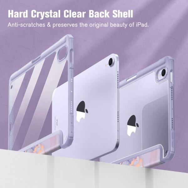 【材料・透明バックカバー】 ケースの表面はPUレザー素材を利用して、軽量、超薄を備えます。ポリカーボネート素材を採用している透明バックカバーは汚れや傷つけなどを防止するだけでなく、iPad本体の色と美しさも活かせます。透明バックカバーの枠は柔軟なTPUを採用して、取り付けも簡単にできます。フロントカバー内部材質はマイクロファイバーで、摩擦によって発生する傷を抑え、液晶画面を保護しきれいに保ちます。(ご注意:透明バックカバーには保護用