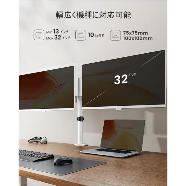 ErGear モニターアーム デュアル 2画面 ホワイト/白 17〜32インチ対応 耐荷重2-7kg VESA規格75*75mm 100*100mm1