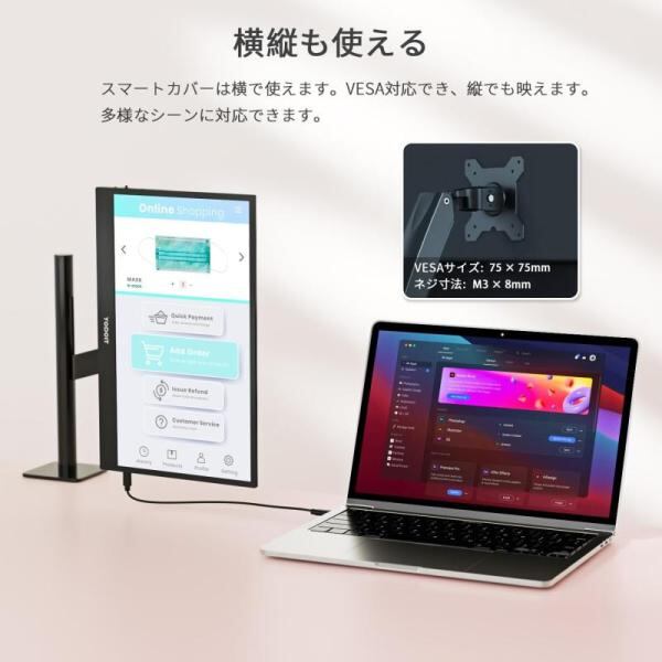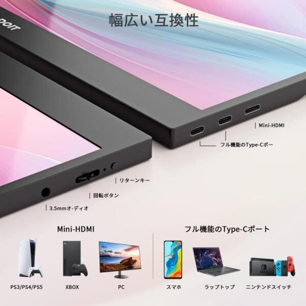 「幅広い互換性」モバイルディスプレイはサブディスプレイとして機能し、効率を向上させることができます。ラップトップ、PC、Mac、スマートフォン、PS4/PS5、XBOX、Switchなどと幅広く互換性があり、ビジネス、旅行、エンターテイメントに最適です。携帯電話を使