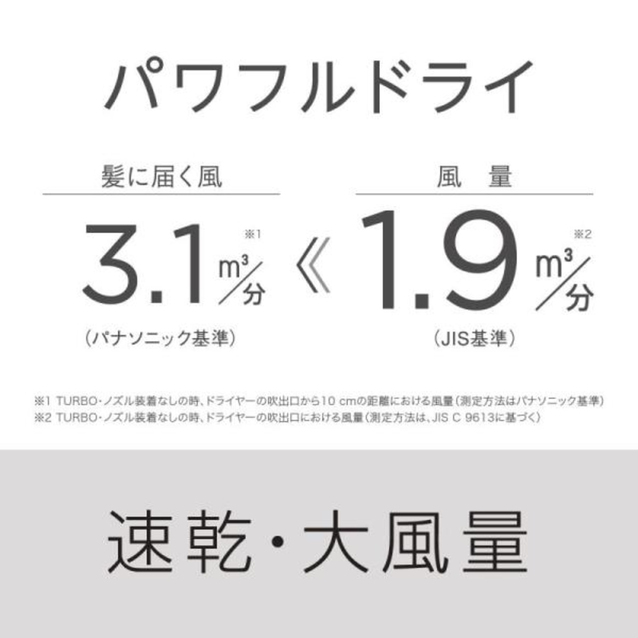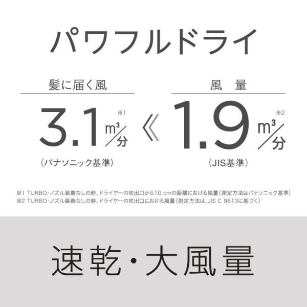 1.9?/分(TURBO・ノズル装着なしの時)自社基準3.1 ?/分(TURBO・ノズル装着なしの時、ドライヤーの吹出口から10 cmの距離における風量。測定方法は自社基準)の大風量で、パワフル乾燥。