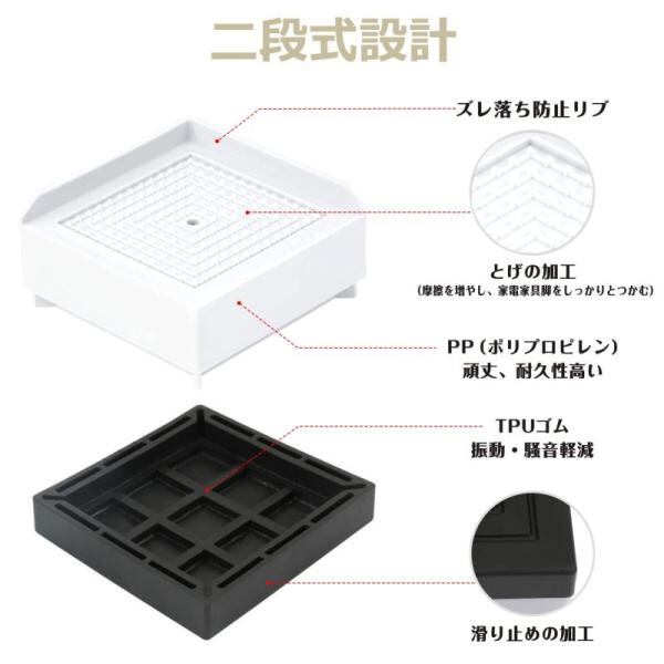 【振動・騒音軽減】500kgの重さにも耐えられ、安定性が高いです。内のグリッド構造とゴム材質は特有な防振性があるので、床に伝える洗濯機の揺れや異音をやわらげてくれます。賃貸物