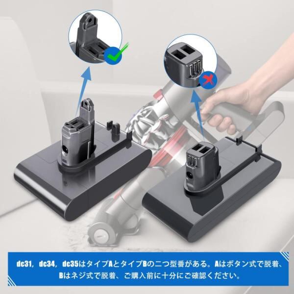 【対応機種】DC43/DC31/DC31Animal/DC31Animal Exclusive/DC34 (DC34 Animal非対応)/DC35 Animal/DC44などに対応しています。ご注意:A型(ボタン式)とB型(ネジ式) がありますので、ご購入前に事前に手持ちのバッテリーを外して形を確認してください。