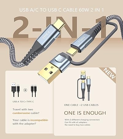 【2in1 デザイン】:usb type a/usb type cとusb type c のインタフェースが同時にが備えているケーブル。多種のケーブルを持つ必要がありません、手間をかけずに、生活はより便利になれます。