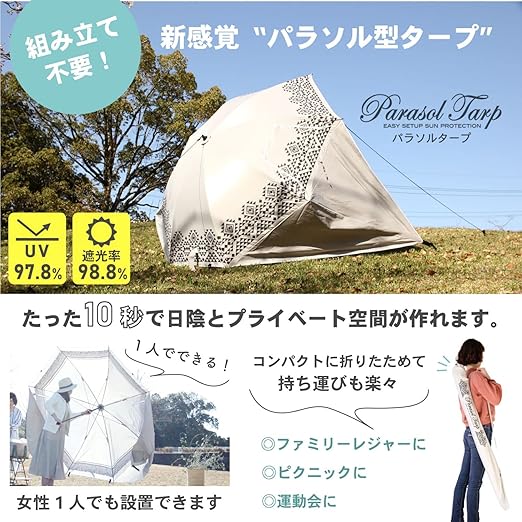 本格的なタープやテントよりも気軽に使える、傘のようにパッと開くだけの簡単タープ