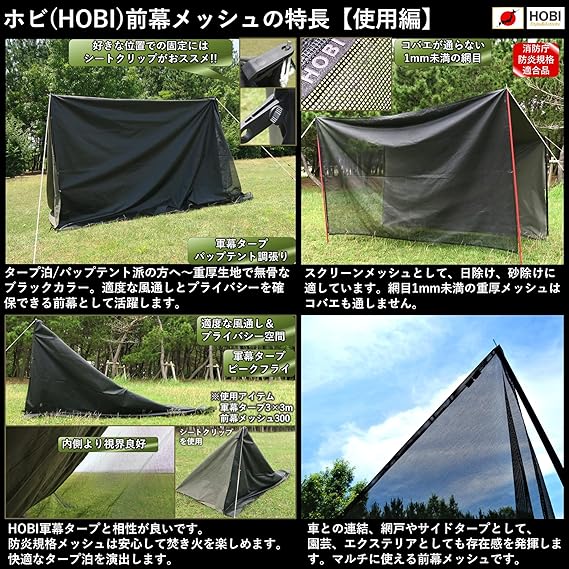 HOBI 前幕メッシュ200【日本製】200×182cm 消防庁防炎規格適合品 [無骨でタフ] 頑丈ハトメ8カ所 軍幕 横幕 スクリーン 砂よけ 日よけ タープ キャンプ アウトドア レジャー ホビ ブラック [MADE IN JAPAN]11