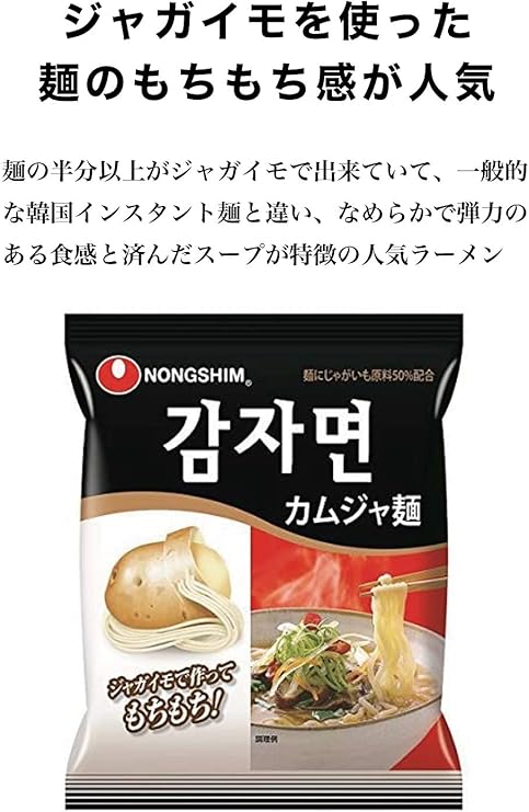 麺の半分以上がジャガイモで出来ていて、一般的な韓国インスタント麺と違い、なめらかで弾力のある食感と済んだスープが特徴の人気ラーメン