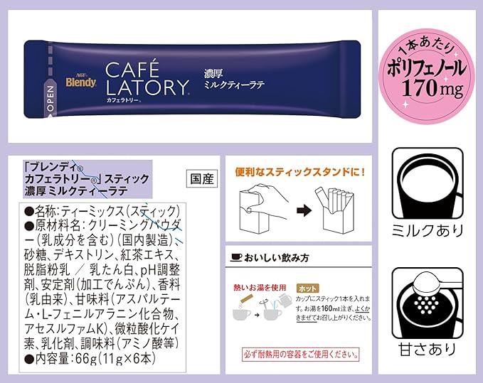 【セット内容】<ブレンディスティック 紅茶オレ8本、紅茶オレ糖質オフ8本、ジャスミンティーオレ6本、ルイボスティーオレ6本、チャイティーオレ6本><ブレンディ カフェラトリー 濃厚ロイヤルミルクティー6本、ザ・ロイヤルミルクティー5本>