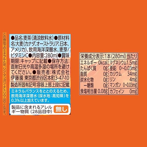 栄養成分(1本(280ml)当たり):エネルギー 0kcal、たんぱく質 0g、脂質 0g、炭水化物 0g (糖類 0g)、食塩相当量 0.08g、マグネシウム 1.5mg、亜鉛 0~0.03mg、カリウム 34mg、リン 4mg、マンガン 0~0.03mg、カフェイン 0mg