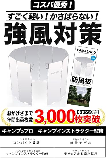 【キャンプインストラクター監修 】キャンプ仲間の声を元にアウトドア・キャンプでなくてはならない相棒・オトモとして、開発 。【2本のペグ】:一般的なウィンドスクリーンはペグ本が殆どですが弊社は2本を採用。このペグを使えば強風で本体が不安定になるのを防ぎます。【枚数調節 可能】:他の風除けは枚数調節ができない使用だったり、芯が針のように尖っていますが、YAMALABOの防風板は枚数調節時に皆様にカンタンに取外しできつつ、勝手に抜けることが無いように芯はこだわり改善しました。【付属のビニールケース】:コンパクトかつ収納時に手間がかからないビニールケースを付属。これで持ち運びがラクラクです。【キャンプインストラクター監修】:実用性に重きを置き開発された製品ですので安心して使用していただけます。実際に使う人の気持ちがわかるキャンパーだからわかる製品へのこだわりを貫いてついに製品化しました。【日本語説明書】:初めてご使用される方には実用的な日本語説明書が付きますので安心してご使用いただけます。