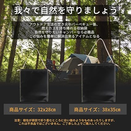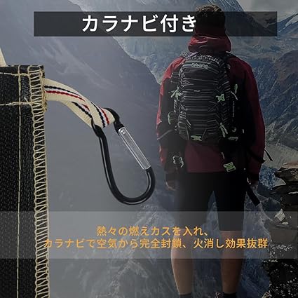 焚き火後の悩みを解決:使用後の炭や薪の燃えカスを安心安全に持ち帰るために、耐熱性・難燃性の生地で作られたポータブル火消し袋です。折りたたみ収納が可能でコンパクトであり、携帯性が高いため、アウトドアに必須のアイテムと言えます。口を締め、内部を酸欠状態にすることで、完全な鎮火を促し、安心安全に炭を持ち帰ることができます。
