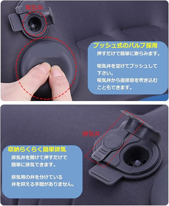 【使い方が簡単 エアー入れ衛生的】新発売の手動プレス式エアー入れは従来の口吹込み式エアー入れより、唾液がつかず衛生的!エアーポンプを手で繰り返して押すと1分弱で、すぐ膨らみます。バルブを開いたらわずか10数秒で空気が抜けます。空気の量を増減させることで高さを自由自在に調整できます。
