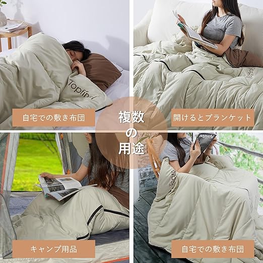 【来客用布団】当寝袋は自宅、帰省、来客時、部屋で広げて敷き布団、掛け布団、レジャーシートなどにご利用頂けます。封筒型シュラフなので、厚着で就寝しても圧迫感なし。 シュラフはアウトドア、野宿、登山、キャンプ、地震防災、テント泊、天体観測、雪山登り、ツーリング、会社残業、防災グッズ様々なシーンで大活躍です。