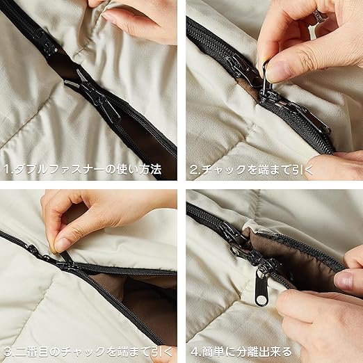【温度調整】当寝袋は、ダブルジッパーを採用し、上下に完全に開けることができます。暑さの程度に応じて完全に開けたり、少し暑い時には足元のジッパーだけを開けたりできます。自由に温度調整出来ます。
