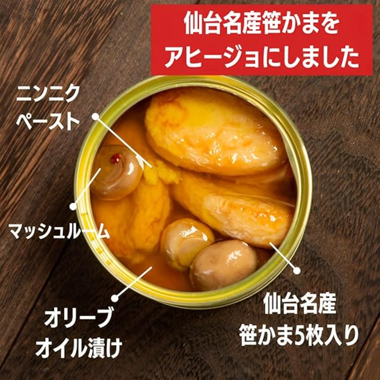 笹かまアヒージョ原材料:笹かまぼこ(国内製造(魚肉、卵白、でん粉、その他))、 食用オリーブ油、マッシュルーム、食用香味油(食用大豆油、食用こめ油、にんにく)、 にんにく、唐辛子/調味料(アミノ酸等)、保存料(ソルビン酸)、V.C、クエン酸(一部に卵・大豆を含む) ■アレルギー:一部に卵・大豆を含む