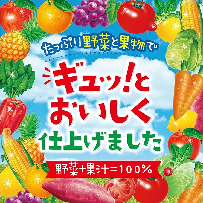 【特長1】8種類の野菜と果物でギュッとおいしく仕上げました! 果汁+野菜汁=100%!