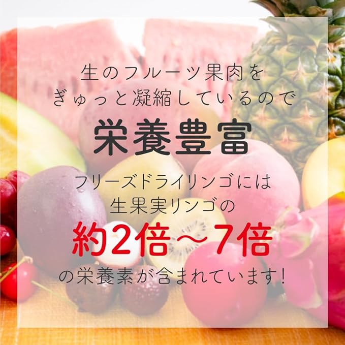 【美味しさと栄養がぎゅっと詰まったリンゴ】リンゴの果肉をそのままフリーズドライにしました。 果肉のビタミン・ミネラル等の栄養素が凝縮され、 生の状態と同じ量で比較すると食物繊維や鉄、カルシウム、ビタミンA、ビタミンCなどの栄養素が圧倒的に多くなります。